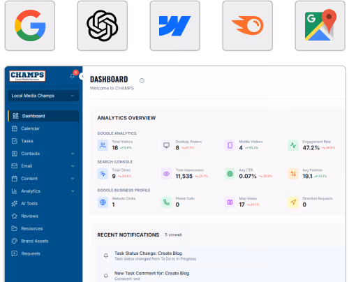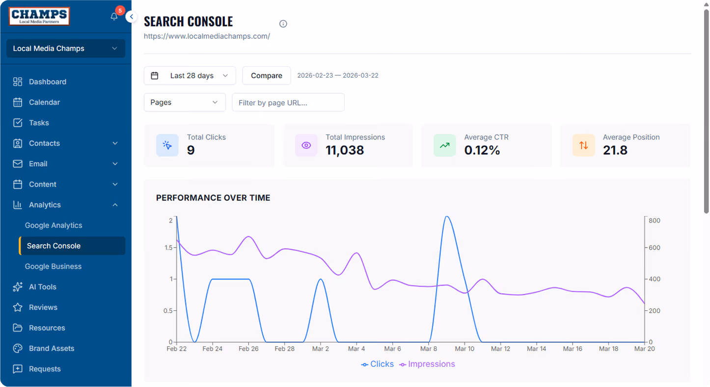 Champs brings your key marketing data into one clear reporting system. Connect Google Analytics 4, Google Search Console, and Google Business Profile to track website traffic, search visibility, and local performance in one place. With interactive charts, detailed tables, and flexible date comparisons, you can quickly understand what is driving results and where to focus next.