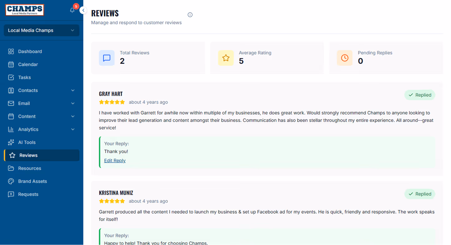 Champs gives you direct access to a team that can support the day-to-day marketing and technology needs of your business. From Google setup and approvals to website edits, research, and strategy guidance, we stay ready to help as needs come up. Most requests are turned around within 48 hours, giving you a reliable in-house resource without the overhead of building your own team.