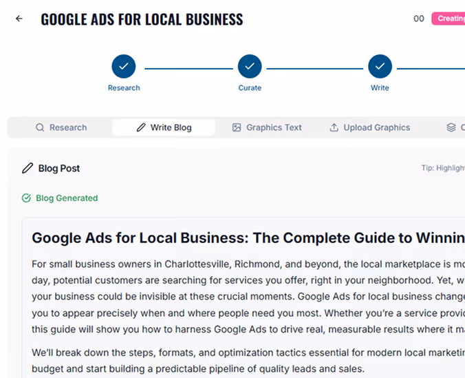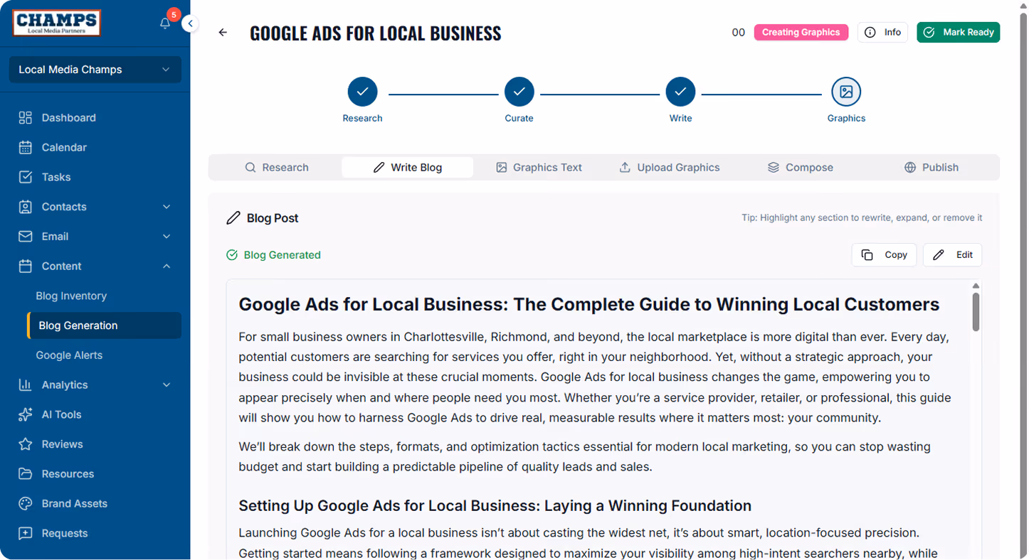 Champs makes content creation faster, more organized, and easier to manage. Our system combines Blog Inventory, Blog Generation, and Google Alerts into one connected workflow that takes you from idea to published article. Whether you want to create thought leadership content around target keywords or respond to current events and industry news, Champs helps you research, write, edit, optimize, design, and publish all in one place.