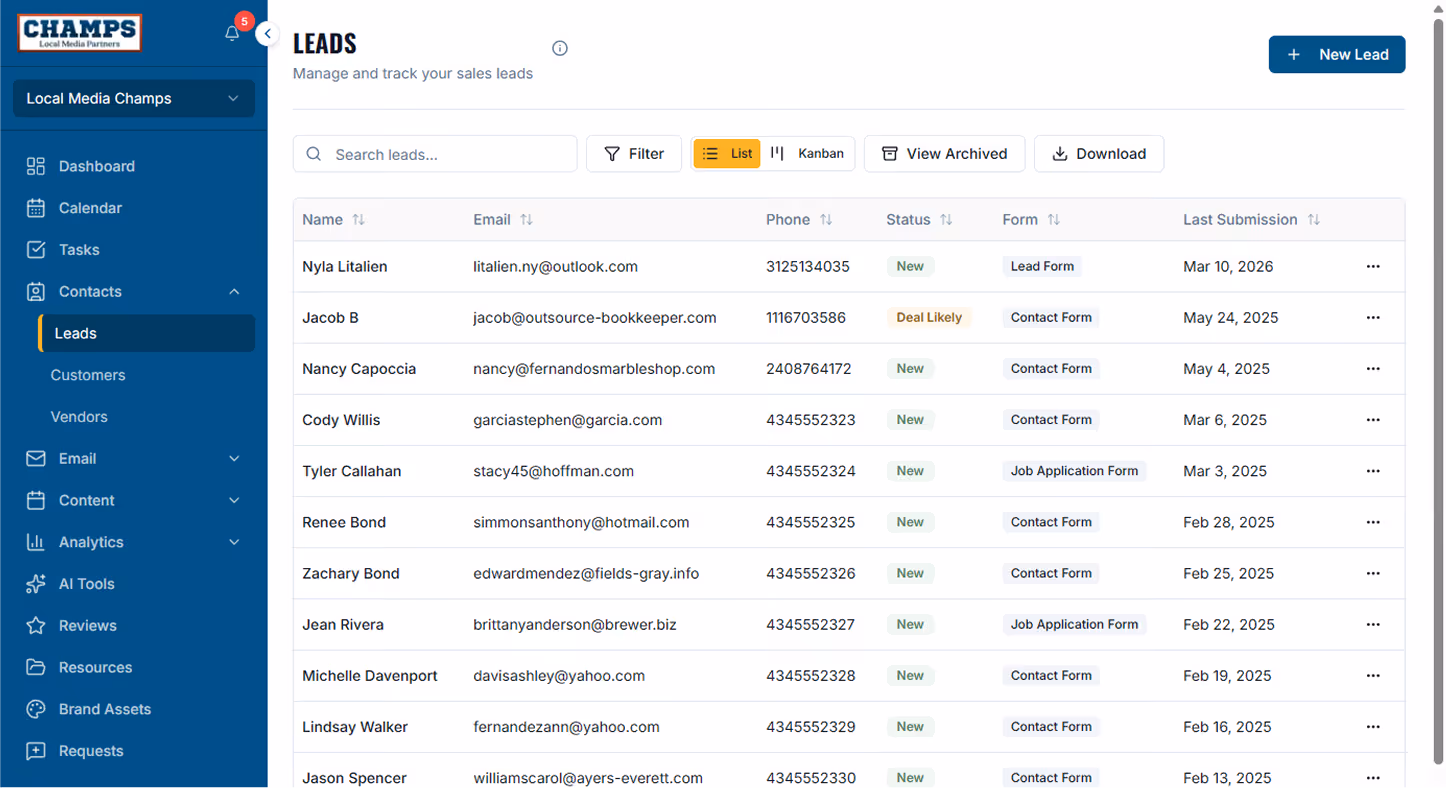 Champs gives you a connected CRM for managing leads, customers, and vendors in one place. Website form submissions flow into the app automatically, where you can email, schedule meetings, create tasks, store files and more. When a lead becomes a customer, Champs gives you the tools to track ongoing work, vendor relationships, and project-related costs.